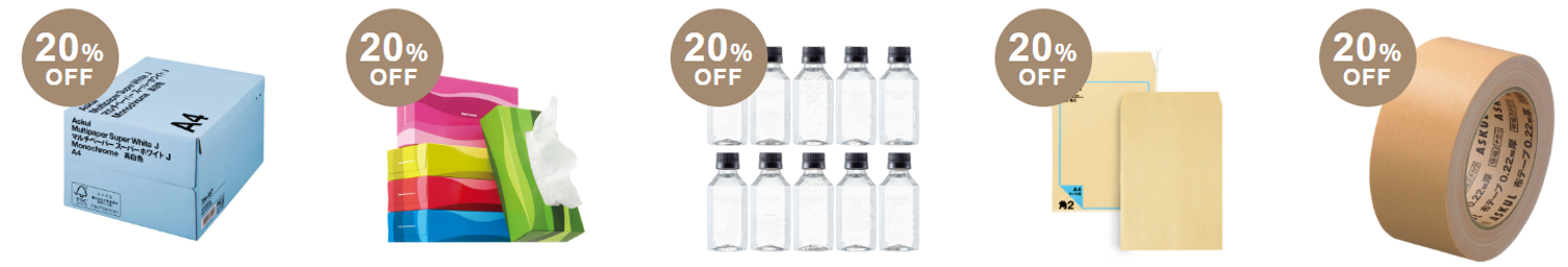 ※1)割引率は2025年12月22日~2026年1月29日午後6時のアスクルWebサイト販売価格に基づきます。2026年3月3日より一部商品が追加となります。追加商品の割引率は2025年12月22日~2026年3月2日午後6時の販売価格に基づきます。2026年3月10日よりコピー用紙(国産)が追加となります。追加商品の割引率は2026年1月12日~2026年3月9日午後6時の販売価格に基づきます。記載の期間には一部商品において一時的に欠品した期間も含みます。